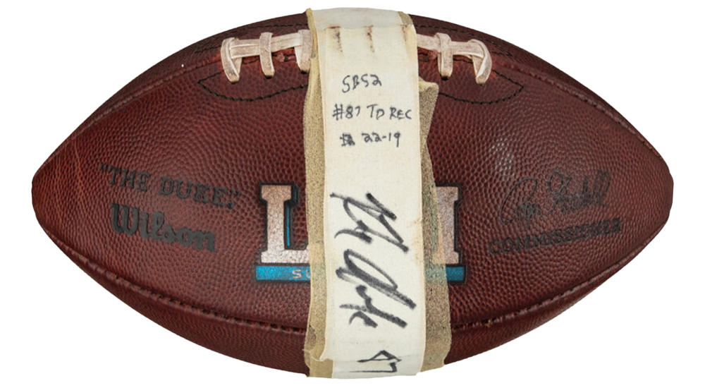 Thrown by Tom Brady to Rob Gronkowski in the third quarter of Super Bowl ⅬⅠⅠ resulting in a touchdown. This ball was given to Gronkowski after the game and has been signed by him.